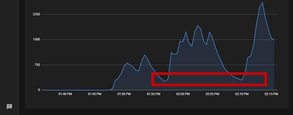 話說,我還真看過短短幾分鐘不斷起起伏伏的數據,(不是我的股票線圖...)是那種一直叫人分享抽東西的FB直播拍賣,因為中間有時候會很乾,人就會離開,然後又因為直播主呼籲分享抽現金,再帶一波人數進來,但通常也是長波段的,不會是這樣五分鐘就漸進式一直衝高。